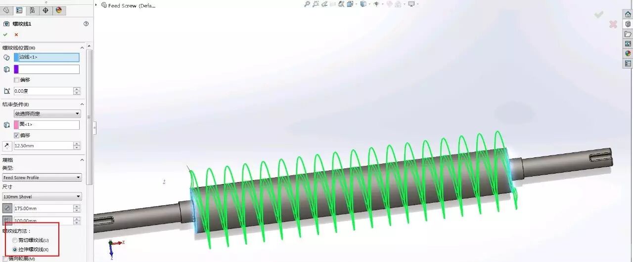 當(dāng)然,除了剪切螺紋線,我們還可以使用拉伸螺紋線來幫助我們生成一些特殊旋轉(zhuǎn)結(jié)構(gòu)的特征,這些特征利用其它手段生成可能會比較麻煩。
