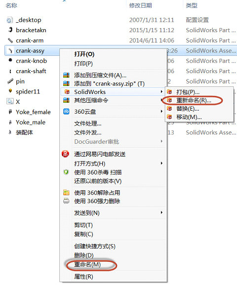 下方的重命名為Windows自帶文件重命名,更改文件名時并未變更裝配體所引用位置。當需要文件重命名時采用上方的:SOLIDWORKS—重命名 如下圖